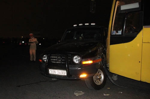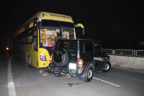 Tại hiện trường xe Korando quay ngang, dính chặt vào đầu xe khách. Công an thành phố Vinh đã chặn làn đường nơi xảy ra tai nạn để đo đạc tìm nguyên nhân.