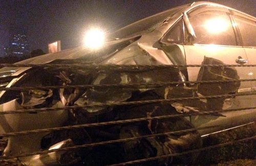 Rạng sáng 12/10, nam tài xế điều khiển xe Inova 7 chỗ khi vừa vượt khỏi hầm chui để vào đại lộ Thăng Long (địa phận quận Nam Từ Liêm), bất ngờ gặp xe máy mang biển kiểm soát Thanh Hoá chở 3 người đi ngược chiều. Tài xế ôtô không kịp xử lý nên cả hai xe đã đấu đầu nhau. Cú va chạm mạnh khiến xe máy chở 3 người nằm gần lề đường bị biến dạng, bánh trước tung ra khỏi xe. Nhiều bộ phận của xe bắn văng tung toé trên đường. Chiếc Inova bị rạn vỡ kính trước và móp đầu xe. Gãy và vỡ gương chiếu hậu sau khi lao lên dải phân cách.