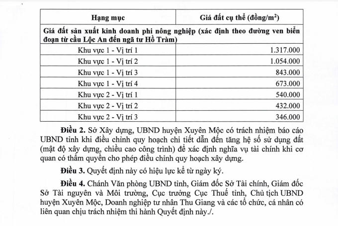 Theo đó, giá đất sản xuất kinh doanh phi nông nghiệp (xác định theo đường ven biển đoạn từ cầu Lộc An đến ngã tư Hồ Tràm) thì vụ trí Khu vực 1 - vị trí 1 cao nhất là 1.317.000 đồng/m2; thấp nhất là Khu vực 2 - Vị trí 3 là 346.000 đồng/m2.