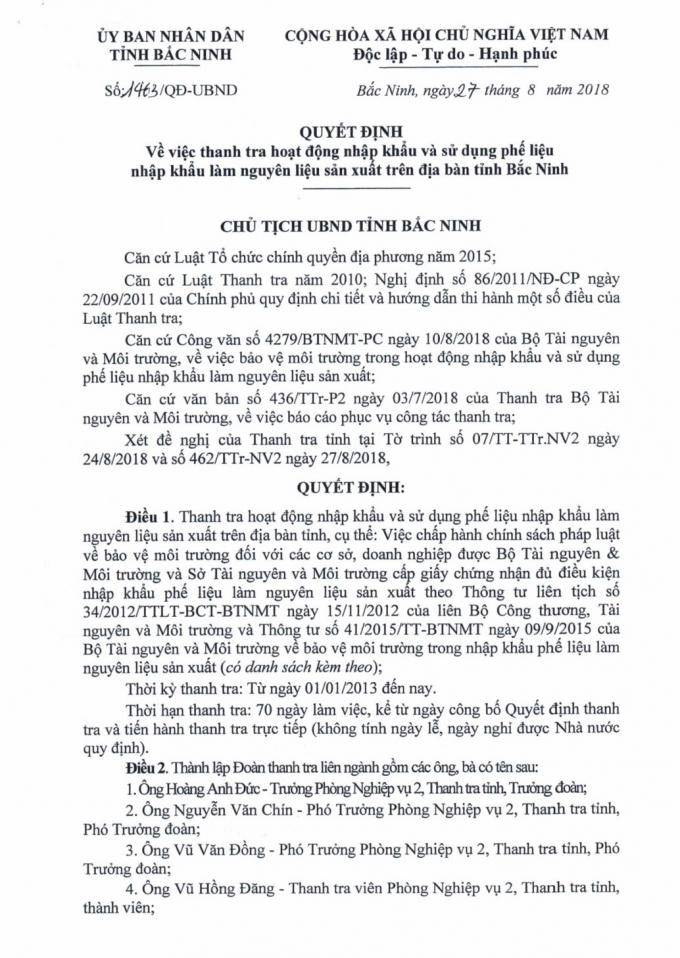 Theo đó, UBND tỉnh Bắc Ninh vừa ban hành quyết định số 1463/QĐ-UBND ngày 27/8/2018, về việc thanh tra hoạt động nhập khẩu và sử dụng phế liệu nhập khẩu làm nguyên liệu sản xuất trên địa bàn tỉnh Bắc Ninh đối với hàng loạt doanh nghiệp liên quan vấn đề này.