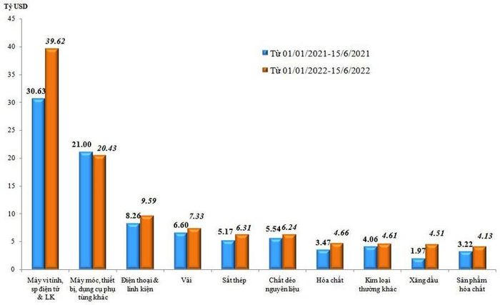 Trị giá nhập khẩu hàng hóa trong kỳ 1 tháng 6/2022 giảm so với kỳ 2 tháng 5/2022 chủ yếu ở một số nhóm hàng sau: máy vi tính sản phẩm điện tử và linh kiện giảm 303 triệu USD, tương ứng giảm 8,3%; vải các loại giảm 129 triệu USD, tương ứng giảm 15,9%; kim loại thường khác giảm 117 triệu USD, tương ứng giảm 20,8%...