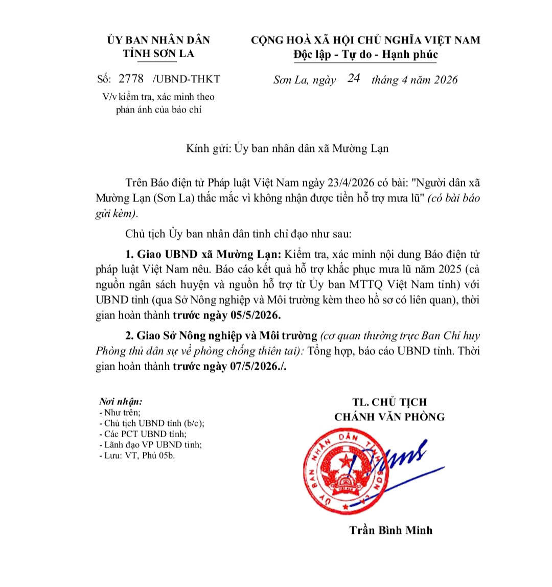 Nội dung văn bản nêu: Trên Báo điện tử Pháp luật Việt Nam ngày 23/4/2026 có bài: "Người dân xã Mường Lạn (Sơn La) thắc mắc vì không nhận được tiền hỗ trợ mưa lũ".