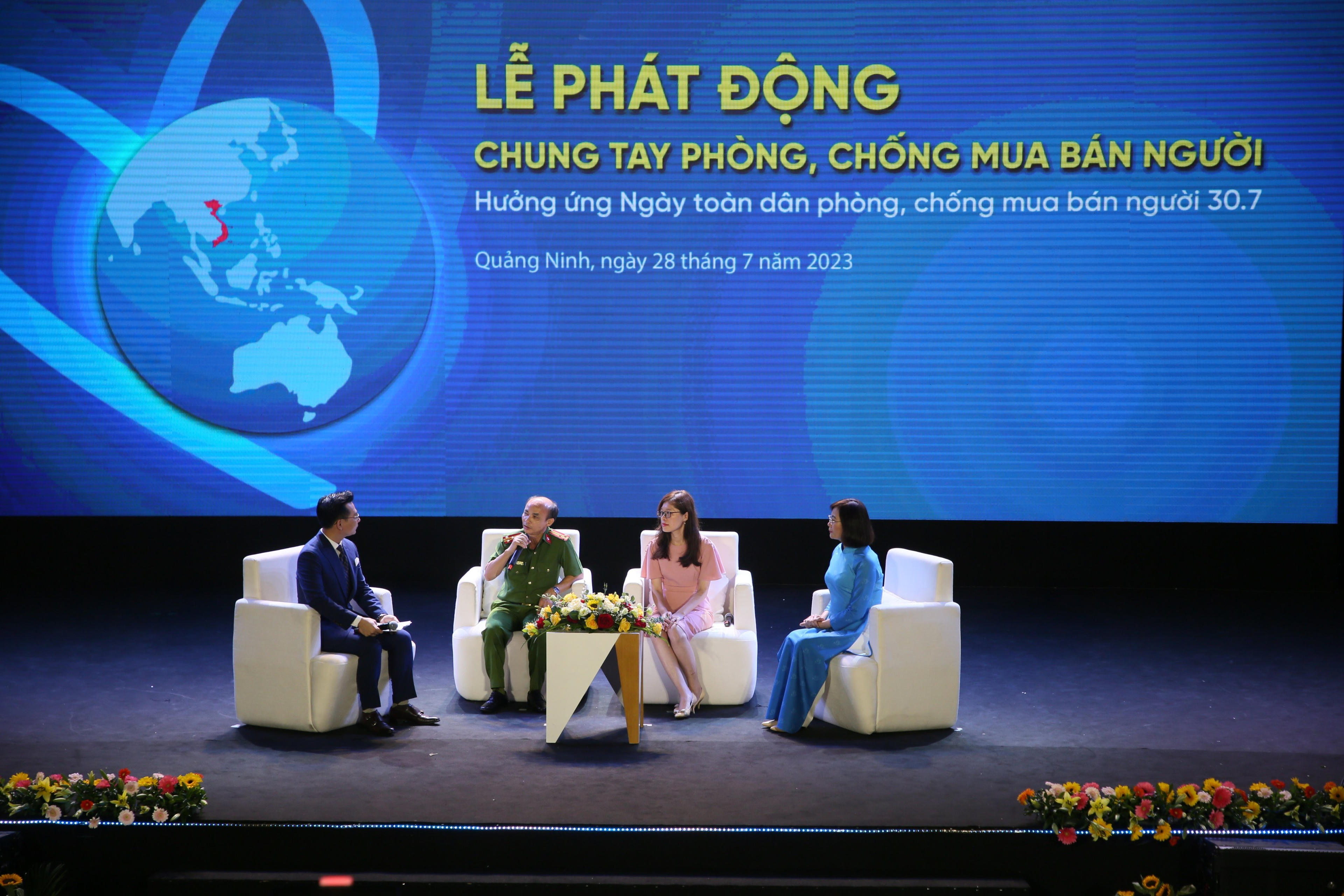 Tại lễ phát động, các đại biểu khách mời đã tham gia tọa đàm, trao đổi, chia sẻ một số vấn đề xung quanh công tác phòng chống mua bán người, như: Công tác tuần tra, kiểm soát địa bàn, ngăn chặn tội phạm mua bán người; công tác phối hợp giữa các ngành, đơn vị và hợp tác quốc tế trong phòng chống mua bán người; các giải pháp hỗ trợ nạn nhân mua bán người trở về với cuộc sống bình thường, tái hòa nhập cộng đồng; công tác thông tin, tuyên truyền, nâng cao nhận thức về phòng chống tội phạm mua bán người...