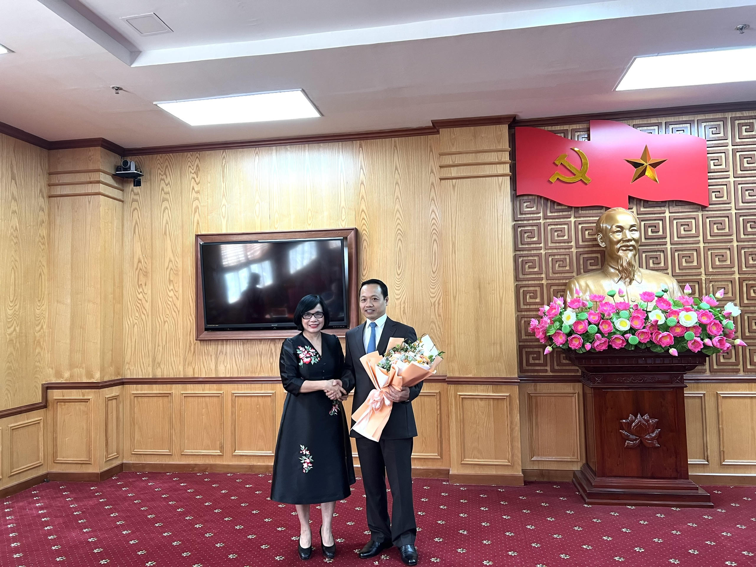 Thứ trưởng Đặng Hoàng Oanh tặng hoa chúc mừng tân Thứ trưởng Trần Tiến Dũng.