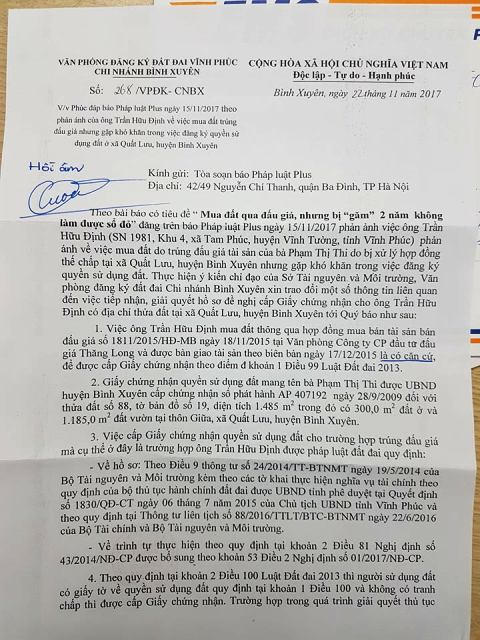 Ngày 22/11/2017, Văn phòng đăng ký đất đai tỉnh Vĩnh Phúc – Chi nhánh huyện Bình Xuyên đã có Văn bản phúc đáp báo Pháp Luật Plus liên quan đến phản ánh của ông Trần Hữu Định về việc mua đất trúng đấu giá nhưng 2 năm không được cấp sổ đỏ.