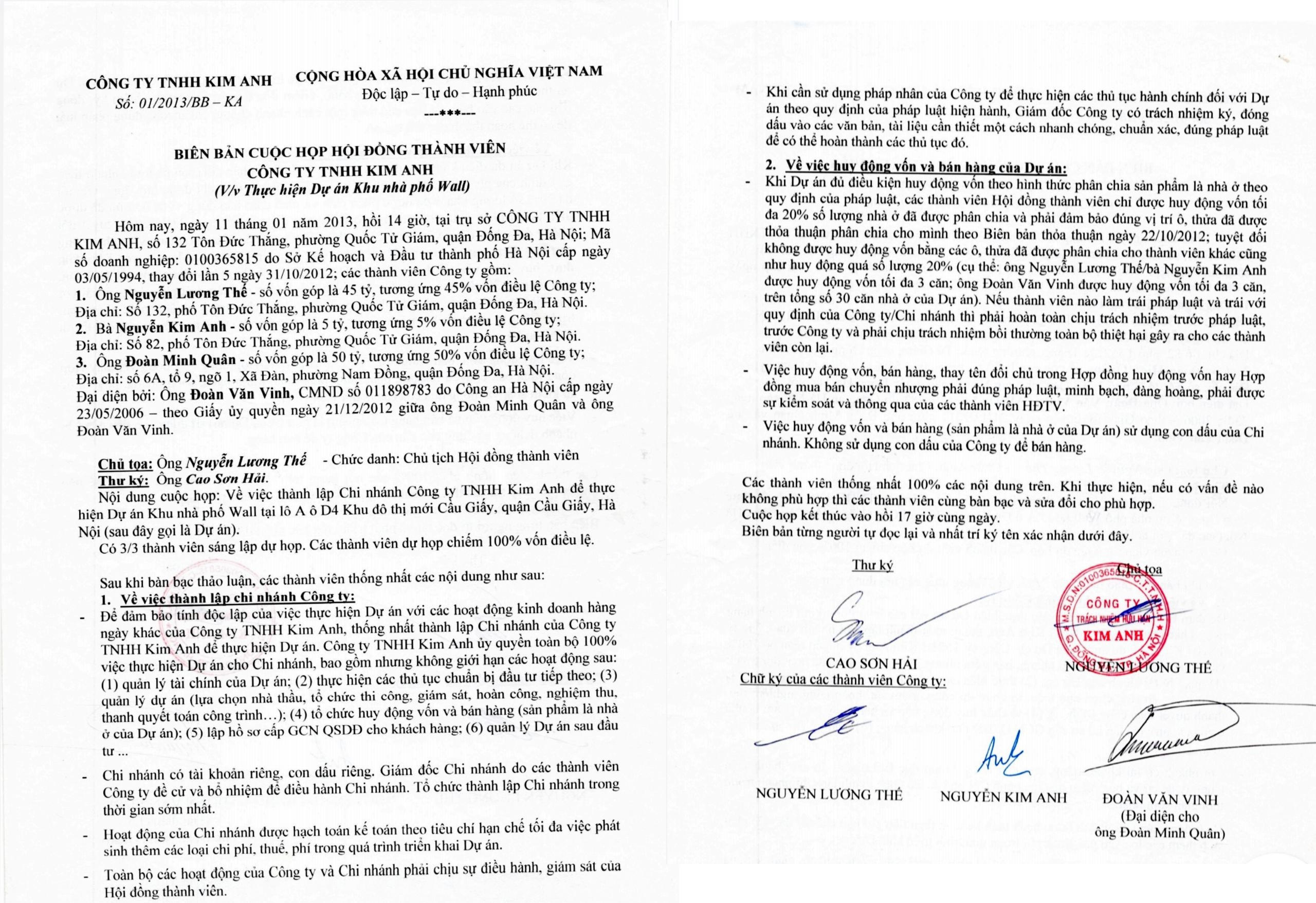 Trước đó, ngày 11/01/2013, Hội đồng thành viên Công ty Kim Anh đã họp và thống nhất một số nội dung, trong đó có việc: Để bảo đảm tính độc lập và thống nhất việc thực hiện Dự án Phố Wall với các hoạt động kinh doanh khác của Công ty Kim Anh, thống nhất thành lập chi nhánh của công ty. Công ty Kim Anh ủy quyền toàn bộ 100% việc thực hiện dự án cho chi nhánh, bao gồm… Tuy nhiên, ông Thế lúc đó với tư cách là Chủ tịch HĐTV, giám đốc công ty đã không thực hiện lập chi nhánh và tiến hành thực hiện dự án và bán 11 căn biệt thự không thông qua hội đồng thành viên là vi phạm Luật Doanh nghiệp.