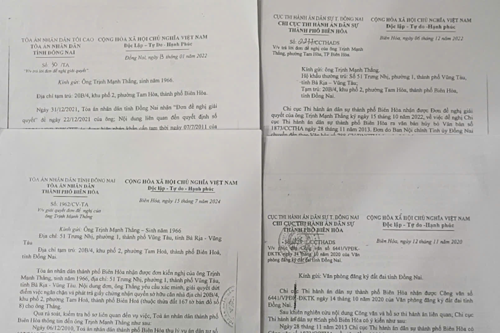 Nhận thấy quyền lợi của mình có dấu hiệu bị xâm phạm, nhiều năm qua, ông Thắng đã gửi đơn khiếu nại nhiều nơi: từ UBNDTP. Biên Hòa (cũ), Văn phòng đăng ký đến Tòa án các cấp và Chi cục Thi hành án dân sự TP. Biên Hòa (nay là Phòng Thi hành án dân sự Khu vực 1 - Đồng Nai).