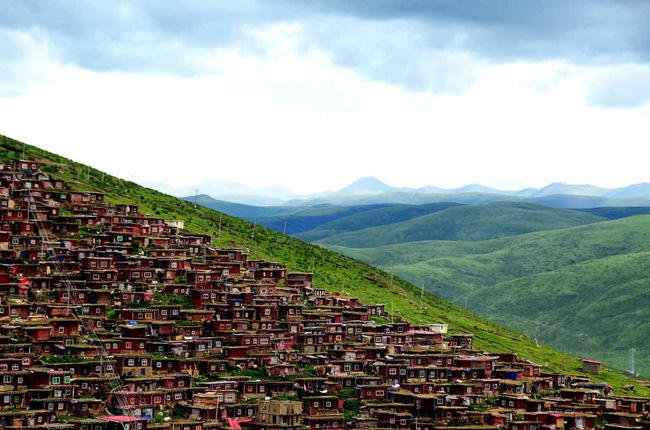 Đặt chân tới Larung Gar, nhiều người đã không khỏi choáng ngợp trước hình ảnh trùng trùng điệp điệp của những ngôi nhà gỗ màu đỏ được xây dựng san sát nhau trên một thung lũng lộng gió và trải dài bát ngát.