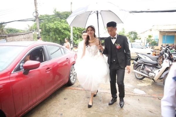 Mạc Hồng Quân che ô cho Kỳ Hân đến nhà hàng tham dự tiệc sau lễ ăn hỏi tại nhà cô dâu.