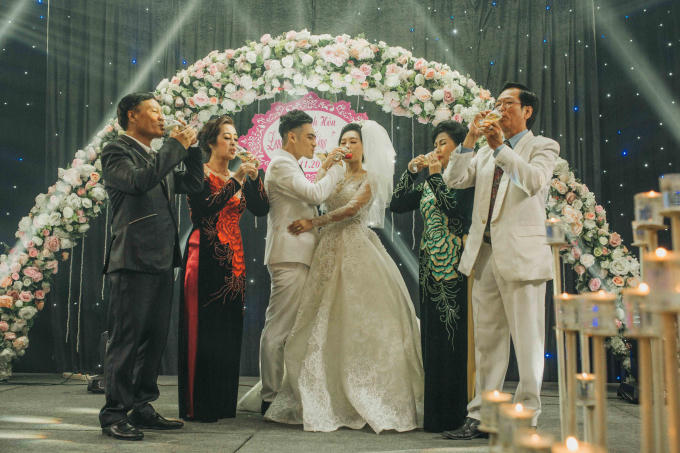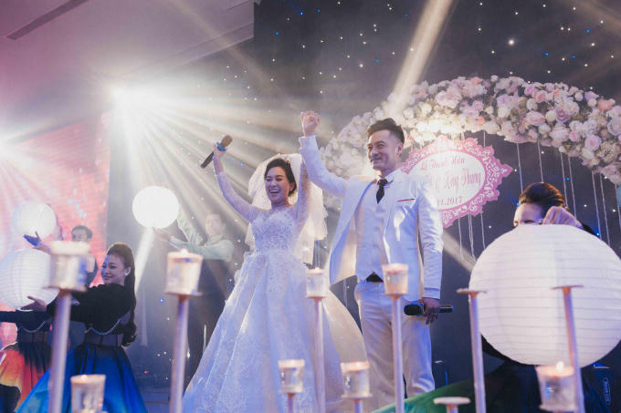 Cô dâu và chú rể bước vào sân khấu trong tiếng nhạc du dương cùng những tràn pháo tay cổ vũ nhiệt tình của quan khách. Không gian tiệc cưới lung linh, rực rỡ như trong truyện cổ tích với gam màu đỏ, trắng làm chủ đạo kết hợp với hoa và nến.