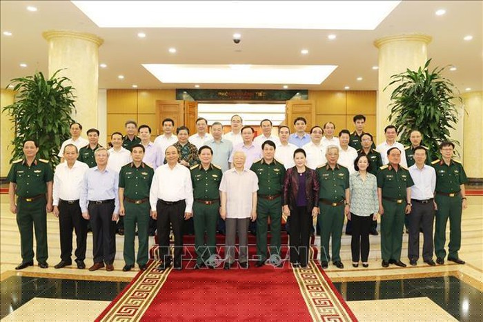 Tổng Bí thư, Chủ tịch nước Nguyễn Phú Trọng, Bí thư Quân ủy Trung ương và các đồng chí Bộ Chính trị chụp ảnh chung với Ban Thường vụ Quân ủy Trung ương. Ảnh: Trí Dũng/TTXVN