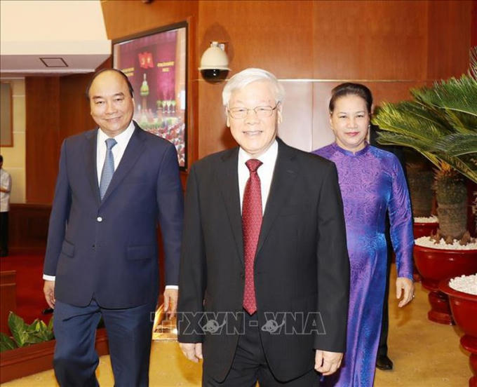 Tổng Bí thư, Chủ tịch nước Nguyễn Phú Trọng cùng Thủ tướng Nguyễn Xuân Phúc và Chủ tịch Quốc hội Nguyễn Thị Kim Ngân đến dự hội nghị. Ảnh: TTXVN