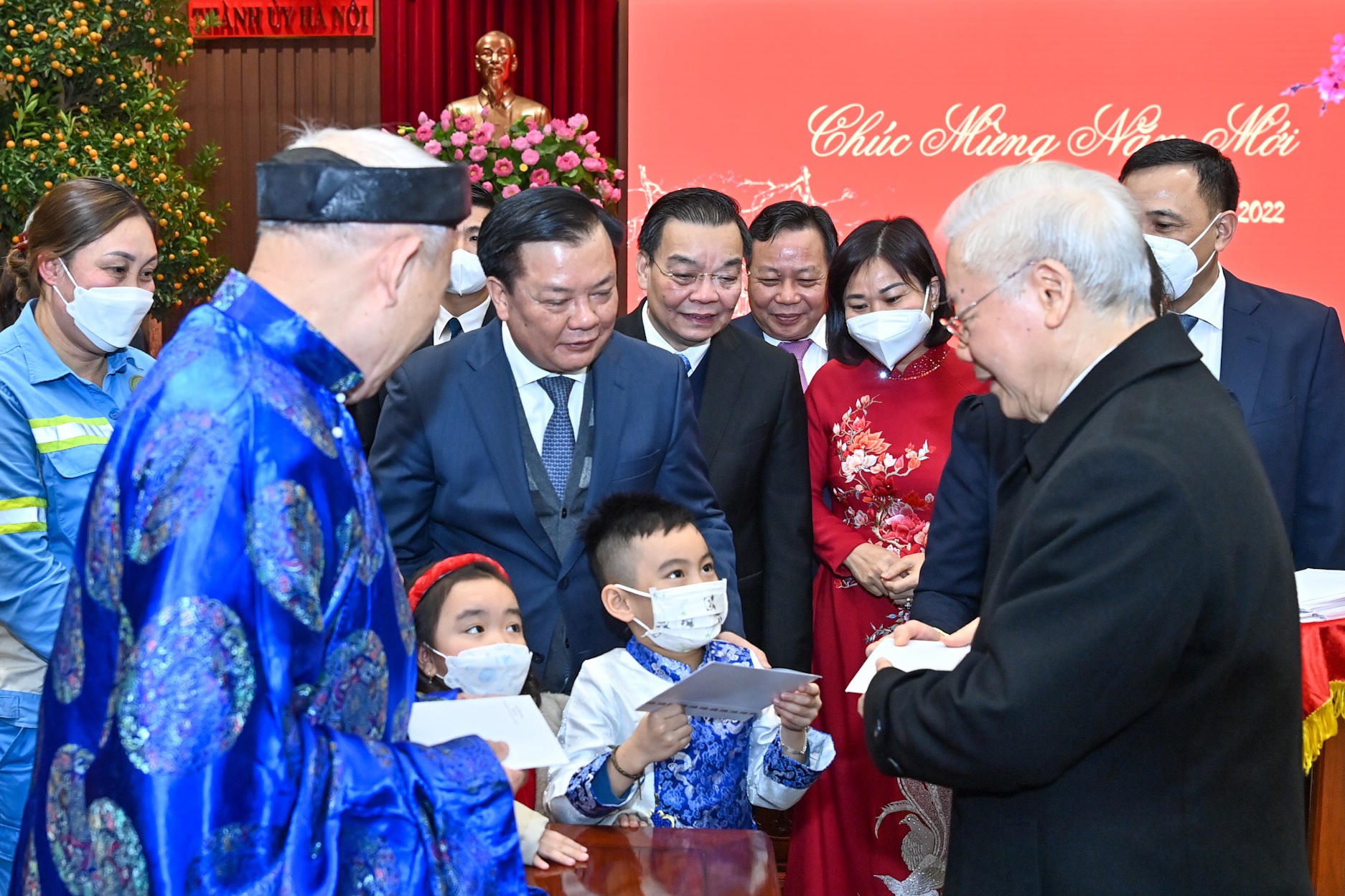 Tổng Bí thư lì xì năm mới cho các cháu thiếu nhi đại diện cho trẻ em Thủ đô, chúc các cháu chăm ngoan, học giỏi.