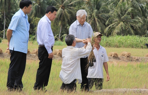 Trực tiếp thị sát những cánh đồng lúa đang bị chết do mặn xâm nhập ở xã Tân Thanh, huyện Giồng Trôm và thăm hỏi người dân, Tổng Bí thư khẳng định Trung ương và chính quyền địa phương sẽ tìm các biện pháp cả trước mắt và lâu dài giúp bà con vượt qua tình hình khó khăn hiện nay.