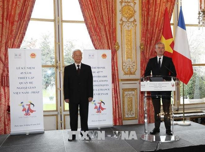 Chiều 26/3 (theo giờ địa phương), tại trụ sở Quốc hội ở thủ đô Paris, Tổng Bí thư Nguyễn Phú Trọng và Chủ tịch Quốc hội Francois De Rugy đã dự Lễ kỷ niệm 45 năm thiết lập quan hệ ngoại giao Việt Nam- Pháp (1973-2018).