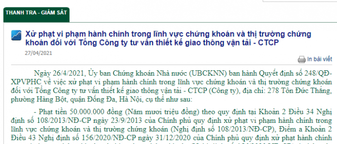 Theo quyết định xử phạt, Tổng Công ty tư vấn thiết kế giao thông vận tải - CTCP bị xử phạt 350 triệu đồng, do "không đăng ký giao dịch, niêm yết chứng khoán".