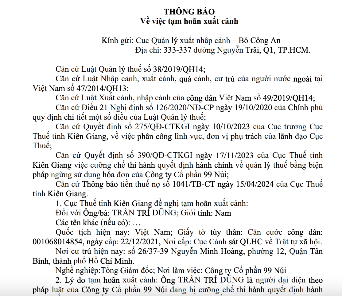 Theo Cục Thuế tỉnh Kiên Giang, đơn vị này vừa có thông báo gửi Cục Quản lý xuất nhập cảnh – Bộ Công an, đề nghị tạm hoãn xuất cảnh đối với ông Trần Trí Dũng (cư trú số 26/37-39 Nguyễn Minh Hoàng, Phường 12, quận Tân Bình, TPHCM) là Tổng giám đốc Công ty Cổ phần 99 Núi.