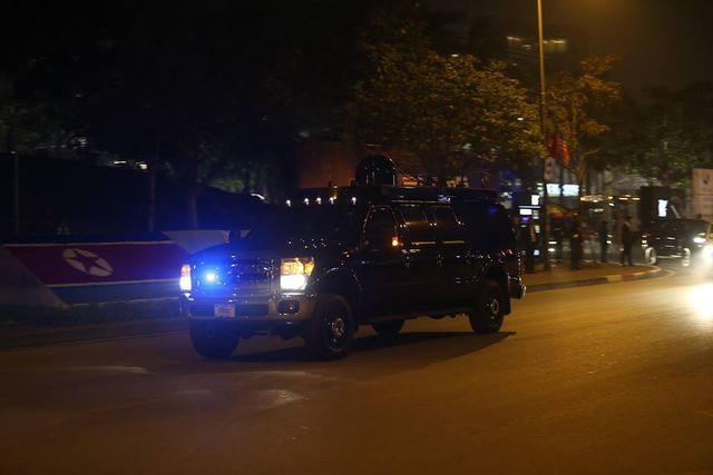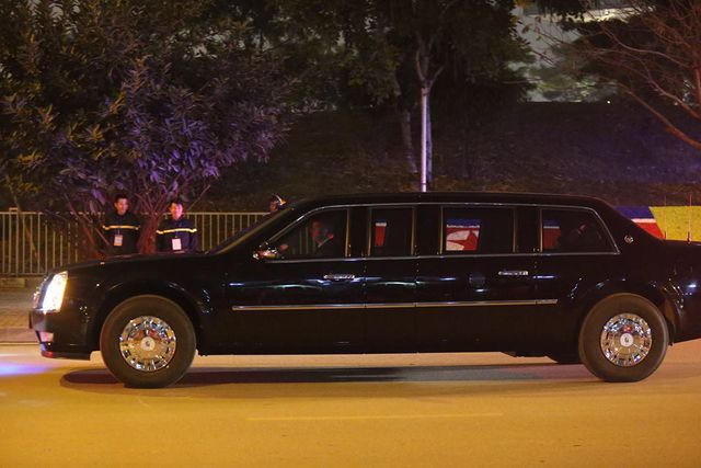 21h14, đoàn xe chở Tổng thống Donald Trump lăn bánh rời sân bay quốc tế Nội Bài. Lực lượng Cảnh sát giao thông dẫn đoàn xe chở Tổng thống Mỹ đi theo ra cổng nhà khách VIP A, chạy thẳng về phía đường Võ Nguyên Giáp - Nhật Tân.