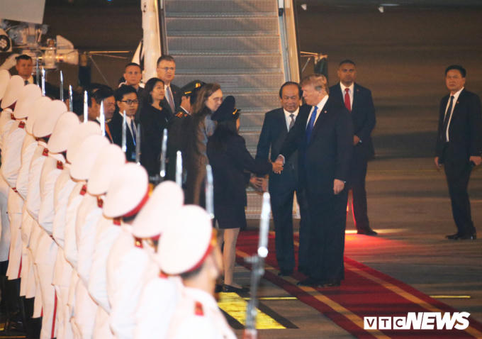 Đón Tổng thống Donald Trump tại chân máy bay có Bộ trưởng - Chủ nhiệm Văn phòng Chính phủ Mai Tiến Dũng. Ông Trump và Bộ trưởng Mai Tiến Dũng vui vẻ chào hỏi trong lễ đón trang trọng tại sân bay.