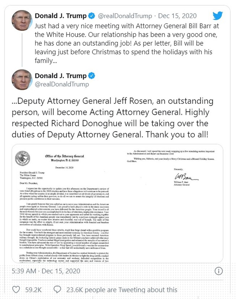 Tổng thống Trump kế đó đăng trọn vẹn thư từ chức của ông Barr lên Twitter, cho biết ông Barr sẽ rời Bộ Tư pháp trước ngày 23/12 tới và dành nhiều lời cảm ơn cho ông Trump vì đã bổ nhiệm ông.