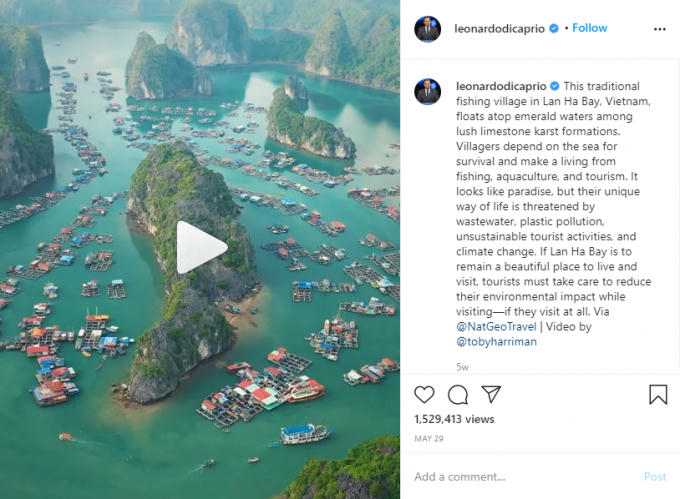 Điển hình như hồi tháng 5 vừa qua, tài tử nổi tiếng Leonardo DiCaprio đã làm cộng đồng mạng Việt Nam nức lòng khi đăng tải hình ảnh về vịnh Lan Hạ, Hải Phòng trên trang Instagram cá nhân. Ngôi sao "Titanic" đã không tiếc lời khen ngợi nơi đây "giống như một thiên đường" và kêu gọi mọi người chung tay gìn giữ môi trường vịnh.