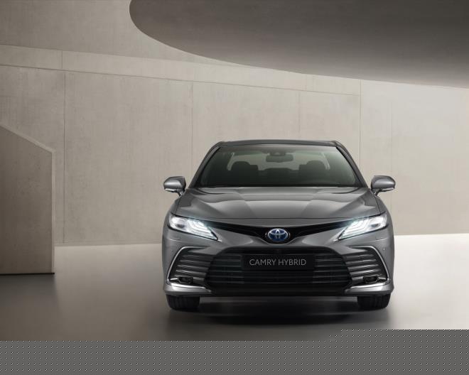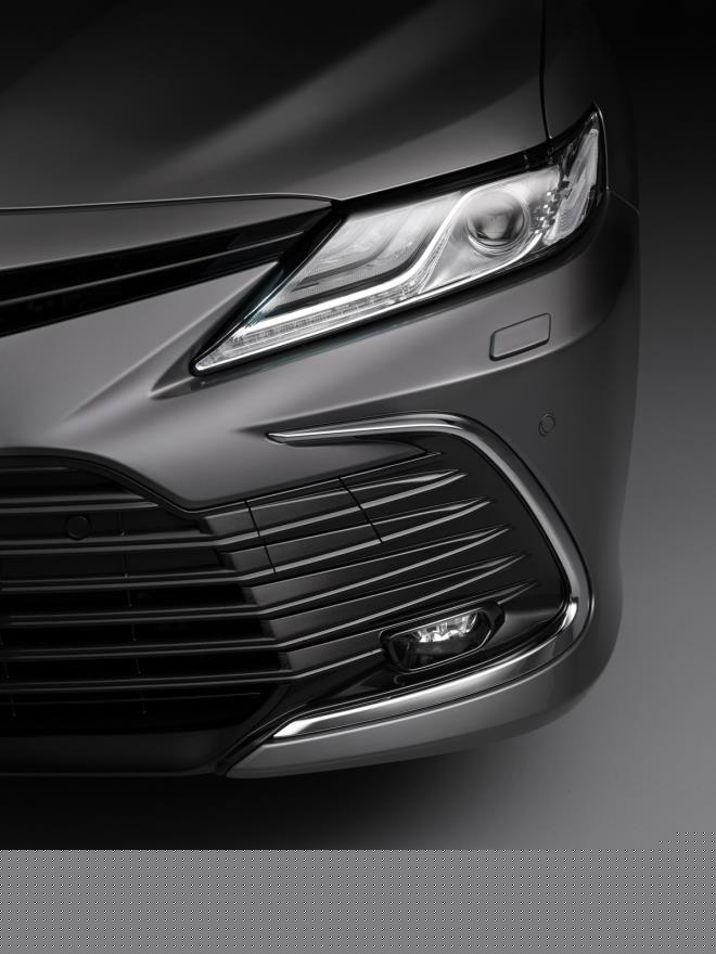 Chiếc Camry Hybrid 2021 nâng cấp có phần đầu xe được thiết kế lại, bao gồm phần cản trước thiết kế lại với lưới tản nhiệt trên và dưới mới. Những thanh ngang trên lưới tản nhiệt phía dưới được mở rộng ra 2 bên để khiến cho chiếc Camry 2021 trông năng động và bề thế hơn.