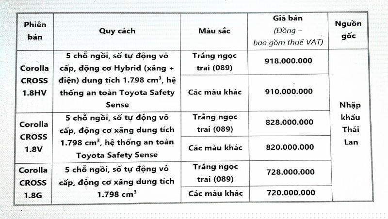 Toyota Corolla CROSS được phân phối với mức giá bán lẻ như sau: