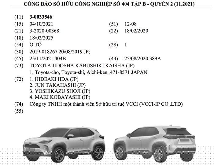 Cục sở hữu trí tuệ Việt Nam đã cấp chứng nhận bảo hộ kiểu dáng công nghiệp cho mẫu xe Toyota Yaris Cross hoàn toàn mới và thông tin này xuất hiện trong công báo sở hữu kiểu dáng công nghiệp số 404 (tháng 11/2021).