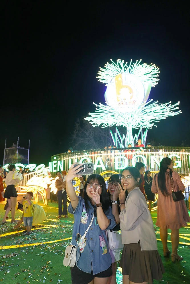 Các bạn trẻ chụp hình lưu niệm tại Con đường ánh sáng, phố đi bộ Nguyễn Văn Trị