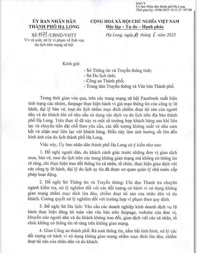 Ngày 19/6, UBND TP Hạ Long, tỉnh Quảng Ninh vừa có văn bản số 4573/UBND-VHTT gửi các cơ quan chức năng về việc rà soát xử lý vi phạm về lĩnh vực du lịch trên mạng xã hội.