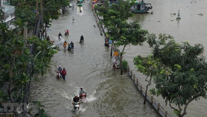 Đường Trần Xuân Soạn, quận 7 thường bị ngập sâu do triều cường. Ảnh: TTXVN