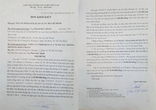 Ngày 16.5, anh Hoan đã gửi đơn khởi kiện phòng khám đa khoa MAYO thuộc công ty TNHH Dịch vụ Y tế MAYO lên TAND Quận 10, TP.Hồ Chí Minh. Trong đơn khởi kiện, anh Hoàn yêu cầu công ty TNHH Dịch vụ Y tế MAYO - phòng khám đa khoa MAYO hoàn phải hoàn trả toàn bộ chi phí trong suốt quá trình điều trị tại phòng khám MAYO, tái khám tại bệnh viện Chợ Rẫy và bồi thường tổn hại về sức khỏe, về tinh thần và công việc của anh trong quá trình điều trị không hiệu quả của phòng khám.