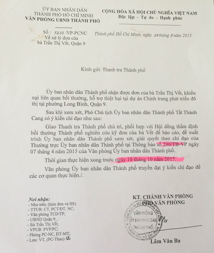 Ngày 29/09/2015, Văn phòng UBND TP HCM có văn bản số 9213/VP- PCNC truyền đạt ý kiến chỉ đạo của ông Tất Thành Cang - PCT UBND Thành phố giao Thanh tra xử lý đơn thư của bà Trần Thị Vết, thẩm định đề xuất thực hiện xong trước ngày 10/10/2015.