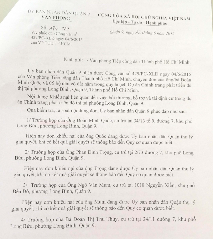 | Văn bản 174/VP ngày 12/6/2015 của VP UBND Quận 9 tiếp nhận ý kiến chỉ đạo, nhưng cũng chỉ là chờ và đang được xử lý? |