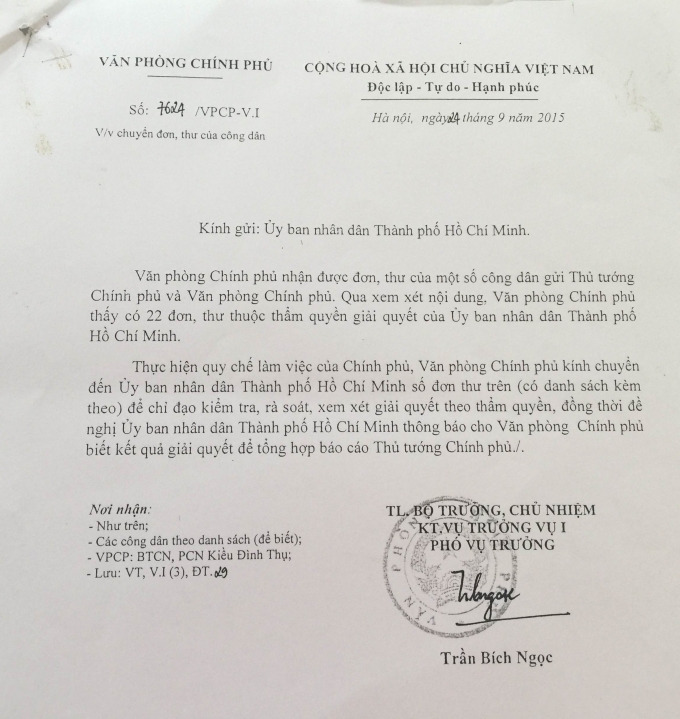 | Văn bản 7624 VPCP/V.I ngày 24/09/2015 chuyển đề nghị của các hộ dân tới UBND TP Hồ Chí Minh giải quyết. |