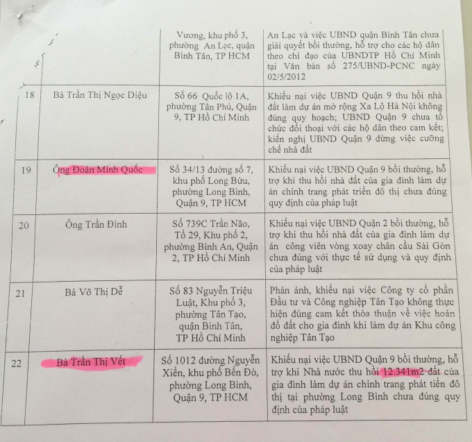 Điển hình là trường hợp hộ gia đình ông Đoàn Minh Trung - bà Trần Thị Vết ở số 1012 đường Nguyễn Xiển, phường Long Bình. Gia đình ông bà có đất nằm trong diện phải thu hồi, giải phóng mặt bằng để phục vụ dự án. Bà Vết cho biết, gia đình bà canh tác và sử dụng hợp pháp toàn bộ diện tích đất hơn 20.000m2, đất đai đều có giấy chứng nhận và hồ sơ sử dụng hợp pháp nhưng UBND quận 9 ra quyết định thu hồi và đền bù khoảng 12.000m2, còn lại gần 9.000m2 vuông không được đền bù. Bức xúc, gia đình bà Vết liên tục khiếu nại đến các cơ quan chức năng có thẩm quyền.