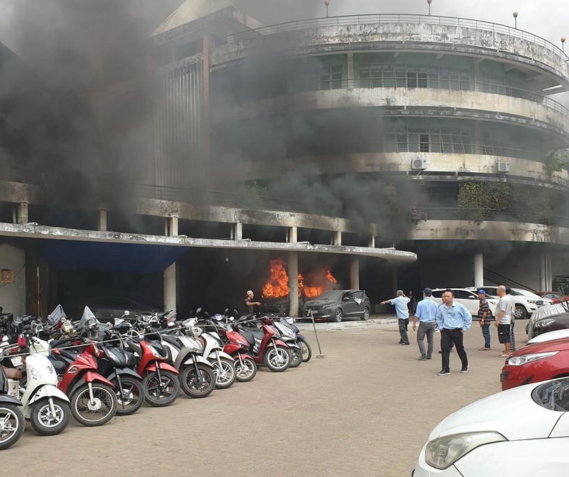 Ô tô trong bãi xe trên đường Lê Hồng Phong, phường 12, quận 10 (TP HCM) bất ngờ bốc cháy dữ dội. Lực lượng chức năng nỗ lực dập lửa.