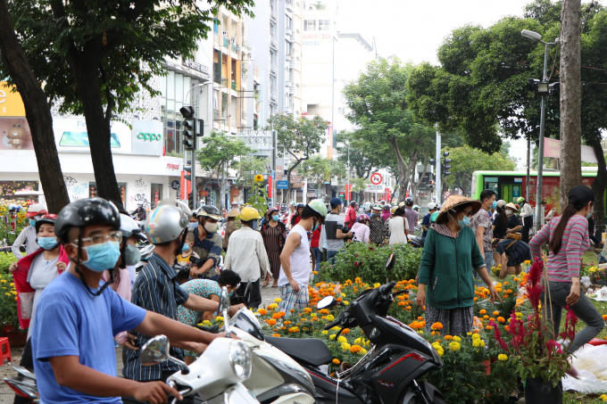 Nhiều thương lái, nhà vườn xổ rẻ hoa từ 40%-50% để kịp giờ trả mặt bằng, về quê ăn tết thu hút rất đông người dân đến mua hoa ngày cuối năm.
