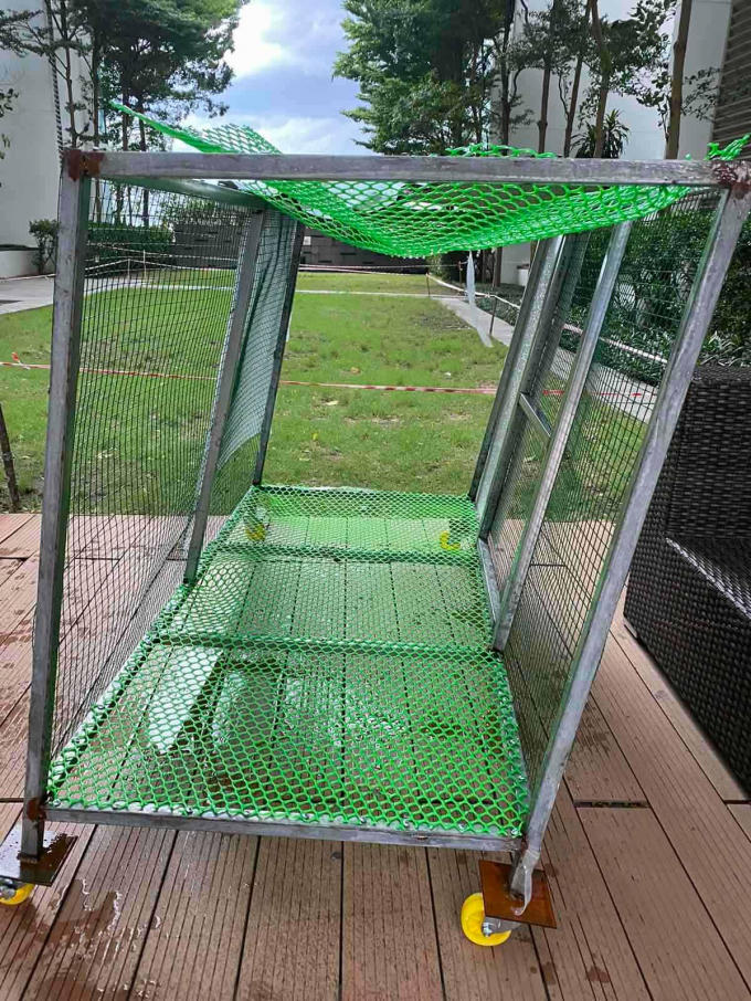 Chuồng nuôi kỳ nhông khung sắt lơn được cho là của một gia đình ở tầng 23 tại chung cư The Vista An Phú bị rơi xuống hồ bơi.