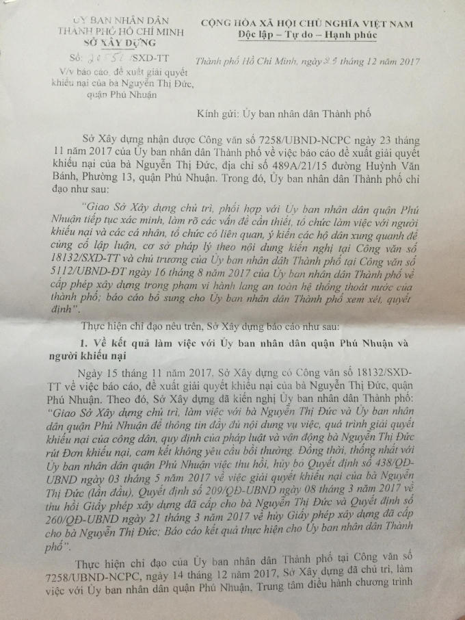 Sau khi bị thu hồi giấy phép xây dựng, bà Đ. đã có đơn khiếu nại gửi các cơ quan chức năng TP HCM, yêu cầu khôi phục lại giấy phép xây dựng trên.