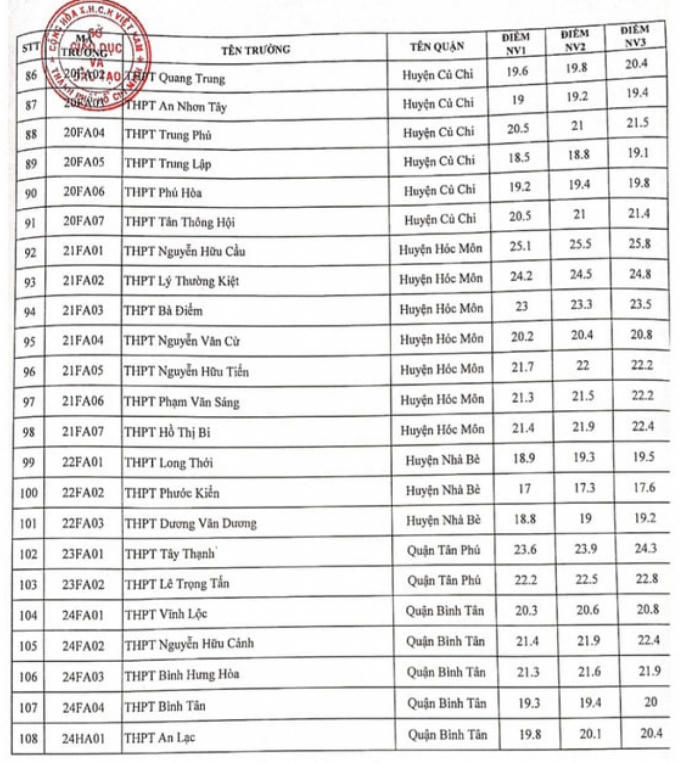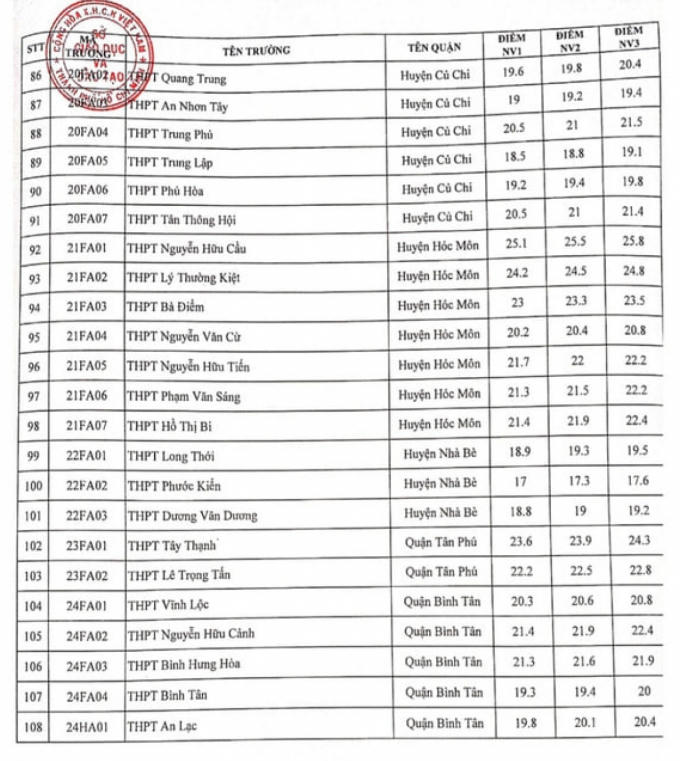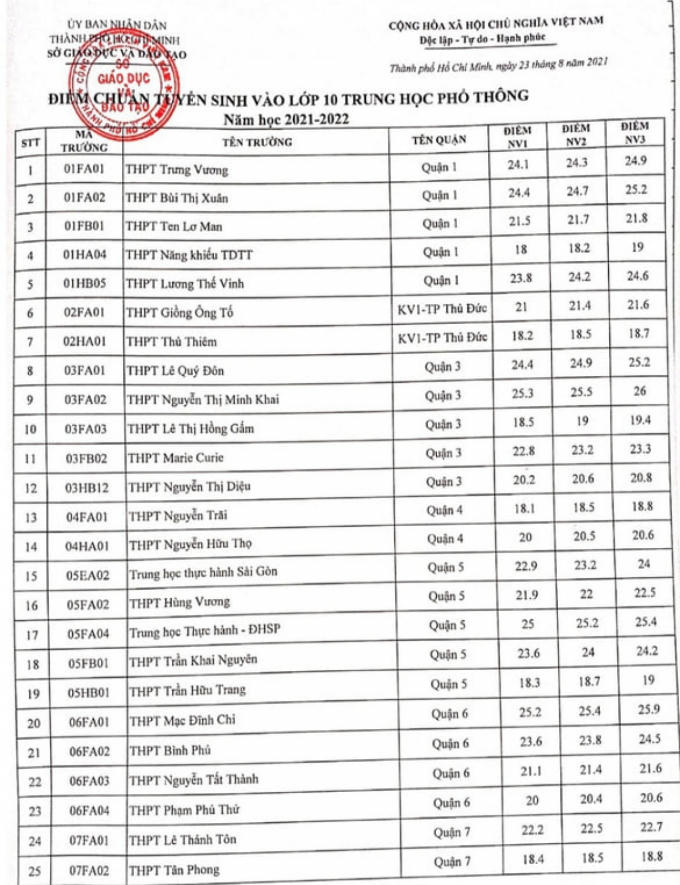 Theo đó, điểm chuẩn năm nay dao động từ 16,8 đến 25 điểm, trường có điểm chuẩn khá cao như THPT Gia Định (quận Bình Thạnh) với nguyện vọng 1 là 25,8 điểm, nguyện vọng 2 là 26,3 và nguyện vọng 3 là 26,8.
