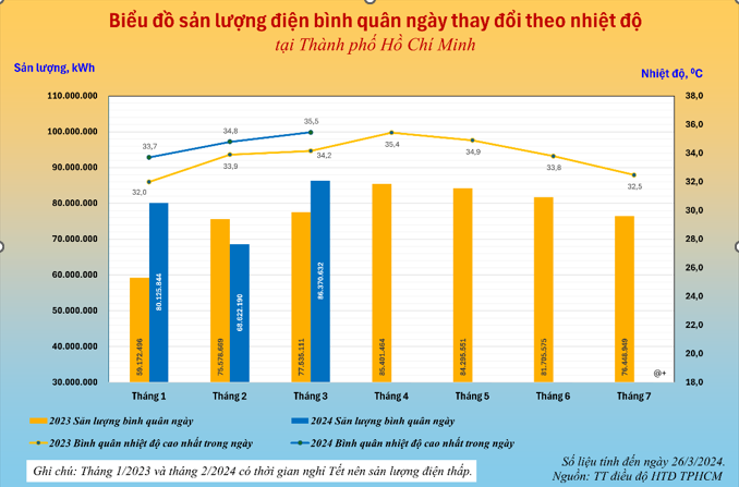 EVNHCMC cho biết dù chưa vào mùa nắng nóng cao điểm, nhưng trong 2 tháng đầu năm 2024, tổng sản lượng điện tiêu thụ tại TP.HCM đã đạt 4,47 tỷ kWh; tại 21 tỉnh phía Nam (trừ TP.HCM) đã đạt hơn 13,5 tỷ kWh, tăng tới 13,7% so với cùng kỳ năm 2023 (số liệu EVN). Dự báo tiêu thụ điện cả nước sẽ tiếp tục tăng từ nay đến tháng 6, Tập đoàn Điện lực Việt Nam đã chỉ đạo các đơn vị thành viên triển khai nhiều giải pháp đồng bộ, quyết liệt, khẩn trương để đảm bảo cung cấp điện cho cả nước.