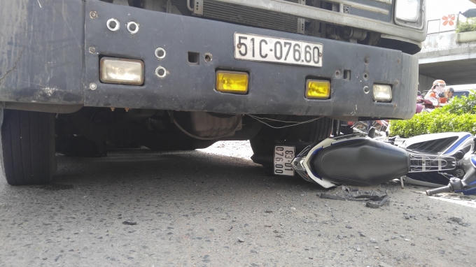 Chiếc xe container trong lúc ôm cua đã cuốn nam thanh niên cùng chiếc xe máy vào gầm khiến nạn nhân tử vong tại chỗ.