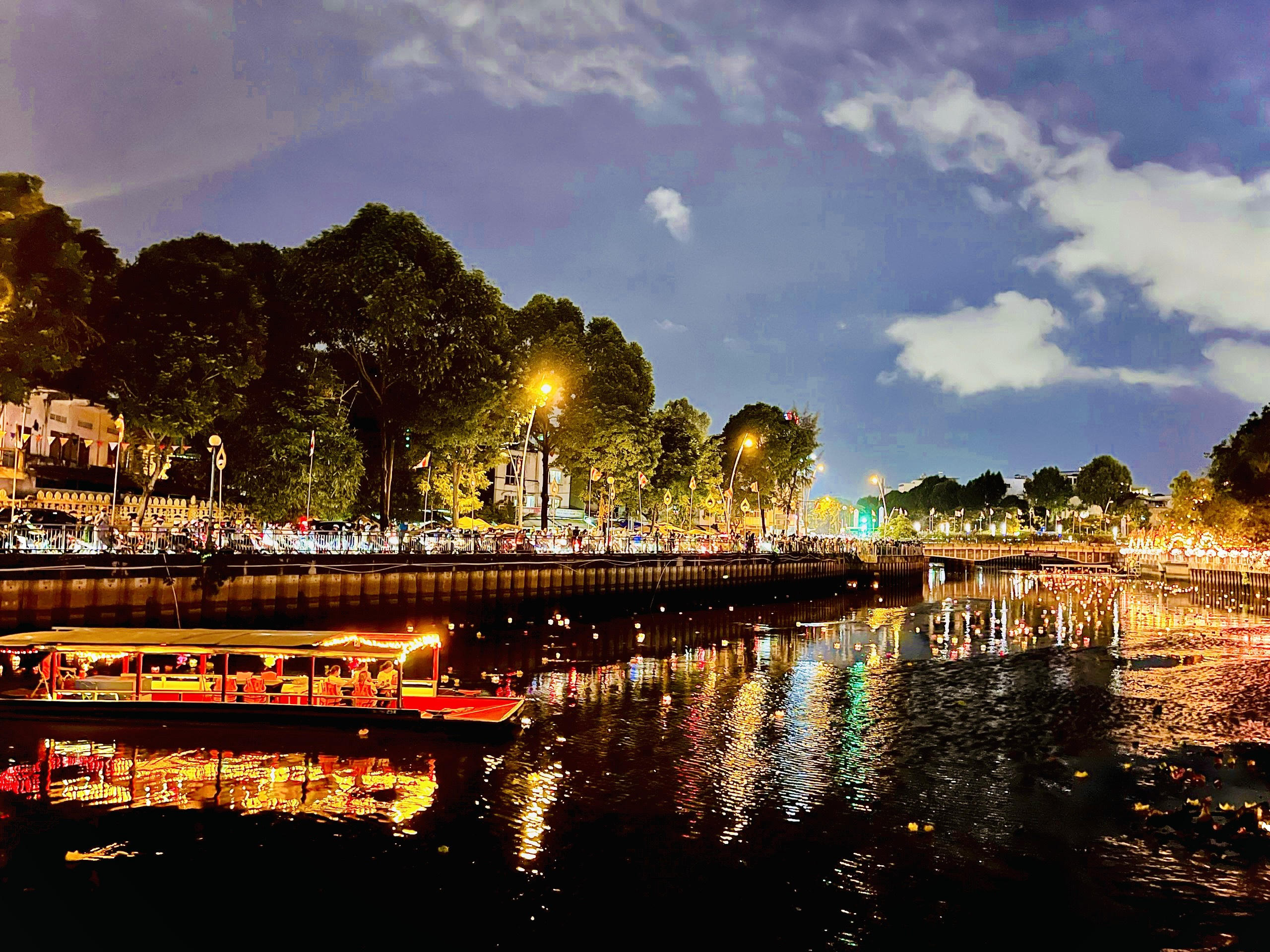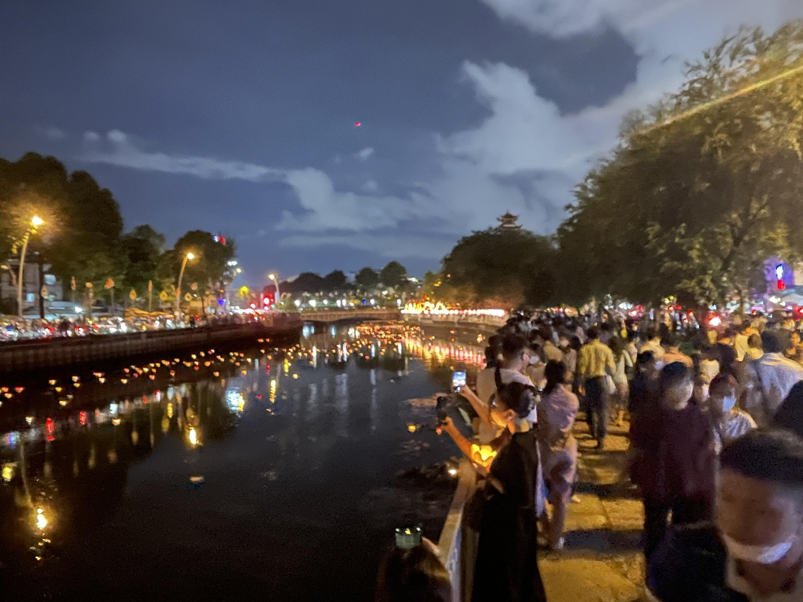 Gần 20h, hàng ngàn người dân đã có mặt dọc các tuyến đường trên bờ kênh Nhiêu Lộc - Thị Nghè để chụp ảnh, nhìn ngắm vẻ đẹp lung linh của dòng kênh cũng như trực tiếp tham gia thả Hoa Đăng.