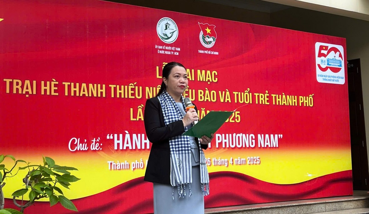 | Bà Vũ Thị Huỳnh Mai – Chủ nhiệm Ủy ban về người Việt Nam ở nước ngoài TP HCM phát biểu khai mạc Trại hè 2025. |