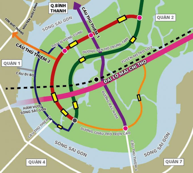 Theo quy hoạch, khu đô thị Thủ Thiêm sẽ kết nối với các quận xung quanh bằng 5 cây cầu (1 cầu đi bộ) và 1 hầm chui. Hiện tại TP đã hoàn thành đường hầm sông Sài Gòn, cầu Thủ Thiêm 1, còn cầu Thủ Thiêm 2 đang xây dựng.