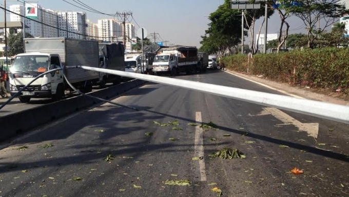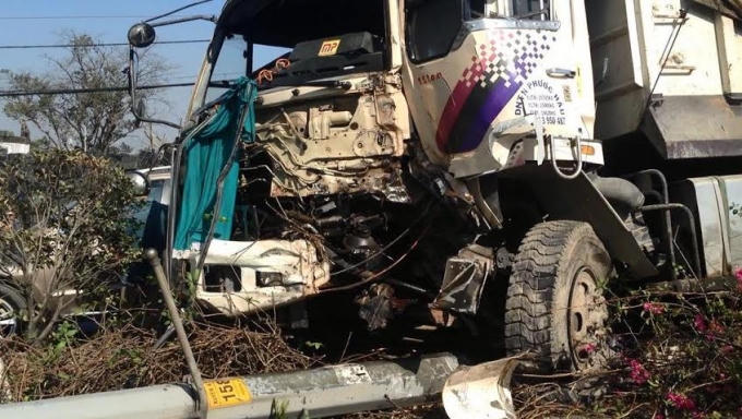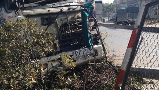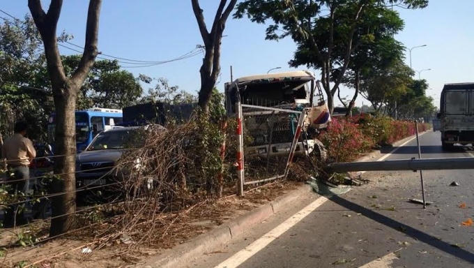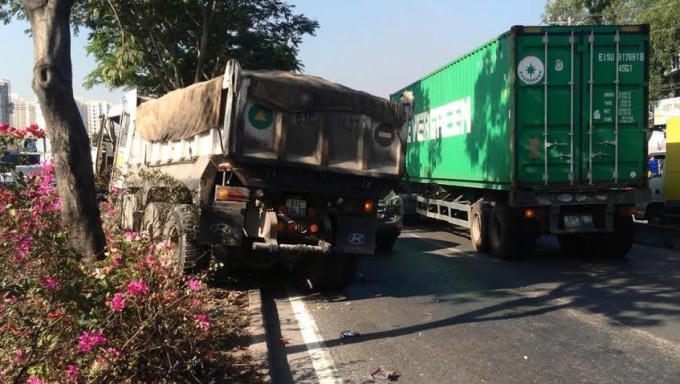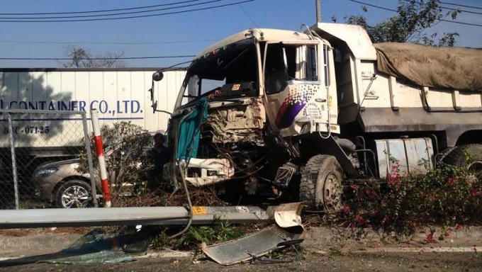 Sau khi va chạm với ô tô 7 chỗ, xe ben tiếp tục đẩy phương tiện về phía trước rồi lao qua bên tay trái, đâm nát hàng rào chắn trên QL1A và cột đèn chiếu sáng, khiến giao thông ùn tắc nghiêm trọng.