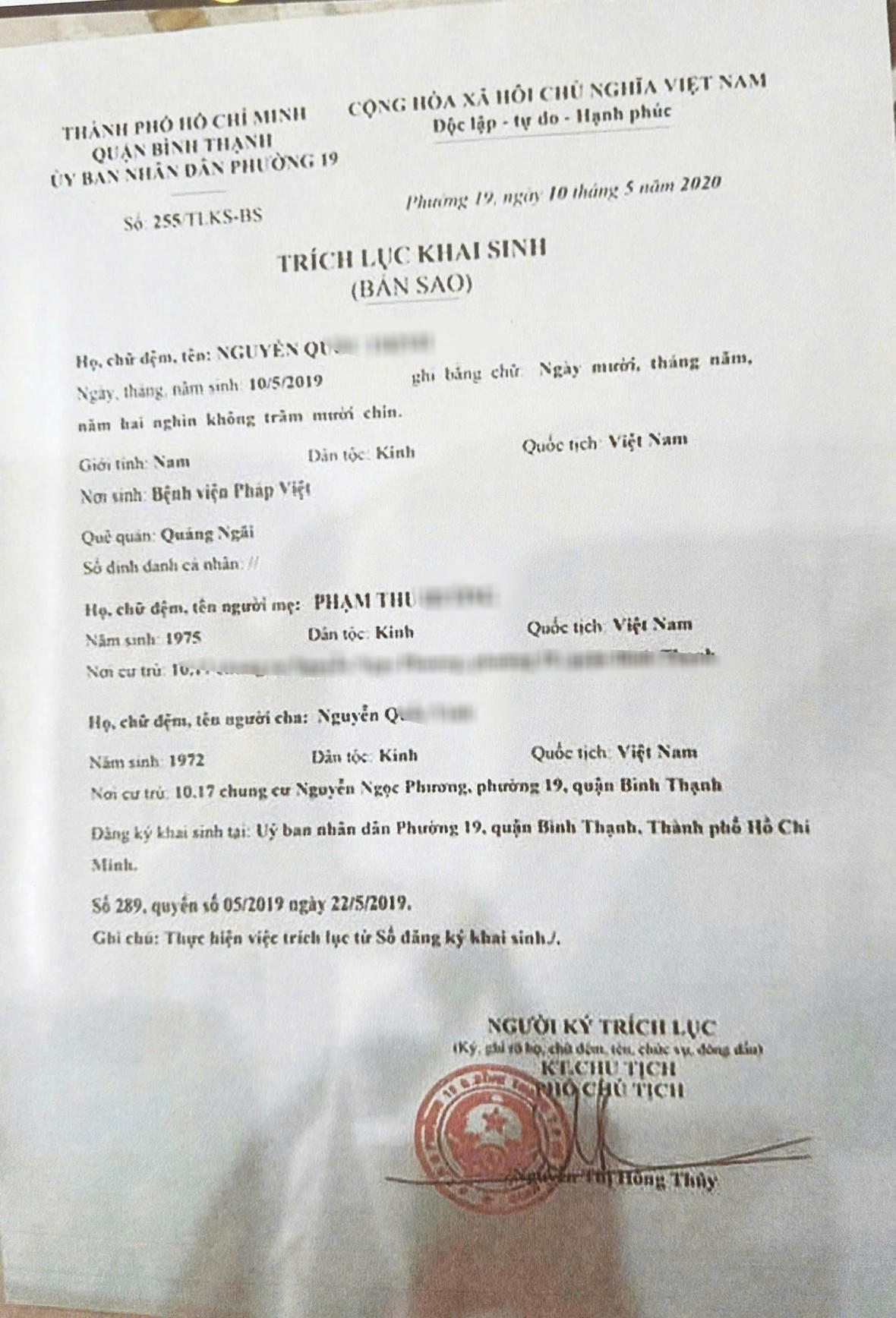 Theo UBND phường Thạnh Mỹ Tây, mới đây phường nhận được thông tin đề nghị làm rõ trích lục khai sinh bản sao số 255/TLKS-BS, ngày 10/5/2020, mang tên Nguyễn Quốc Th. (SN 10/5/2019, giới tính nam), có thông tin bố là Nguyễn Quốc V. (SN 1972); mẹ là Phạm Thu H. (SN 1975), nơi cư trú 10.17 chung cư Nguyễn Ngọc Phương (phường 19, quận Bình Thạnh cũ - nay là phường Thạnh Mỹ Tây, TP HCM).