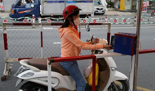 16h ngày 7/9, cảnh sát lắp hộp đựng camera trên giá đỡ cao hơn một mét trước chốt kiểm soát dịch trên đường Lê Văn Duyệt, phường 1 (quận Bình Thạnh) bắt đầu quét mã khai báo. Từng người dân dùng điện thoại có mã QR đưa trước camera thay vì được kiểm tra bằng điện thoại của lực lượng gác chốt như trước.