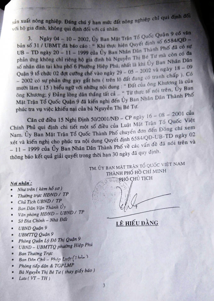 Công văn của Ủy ban MTTQ Việt Nam TP HCM cũng cho biết, khi thực hiện QĐ 6584 của TP đã có sự phản ứng không chỉ riêng của gia đình ông Khương mà đa số nhân dân tại Khu phố 6, phường Hiệp Phú cũng phản ứng gay gắt, nhất là khi UBND quận 9 tổ chức hai đợt cưỡng chế vào ngày 29/5/2002 và 18/9/2002.